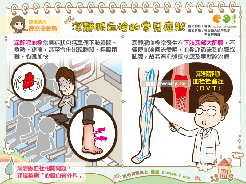 長途旅程久坐少動,當血液循環不良、靜脈血液回流不易,恐造出現血栓危機!王志軒醫師說明,所謂的「經濟艙症候群」在醫學上稱為深部靜脈血栓栓塞症,簡稱「深靜脈血栓」(Deep venous thrombosis, DVT),通常是發生在下肢深部的大靜脈,常見症狀包括單側下肢腫脹、發熱、疼痛,甚至合併出現胸悶、呼吸困難、心跳加快等不適。