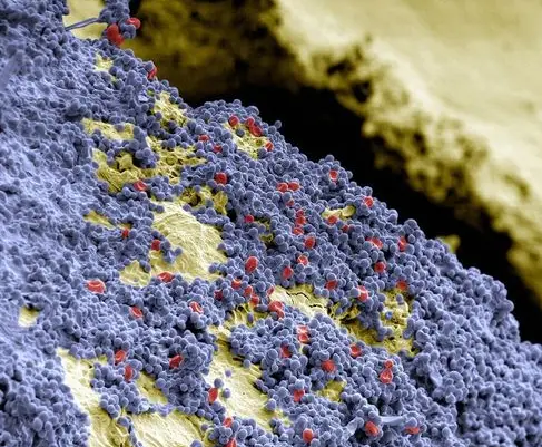 藍色的球形地毯細菌和紅細胞緊緊貼著黃牙表面。