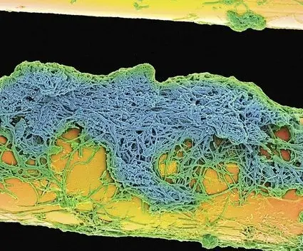牙齒表面附著著大量黃色牙板,牙板上則是更多的藍色球形地毯細菌。