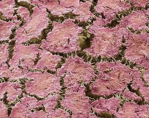 這是牙齒放大一千倍的彩色照片,上面顯示了點狀潛伏在牙齒上的細菌。